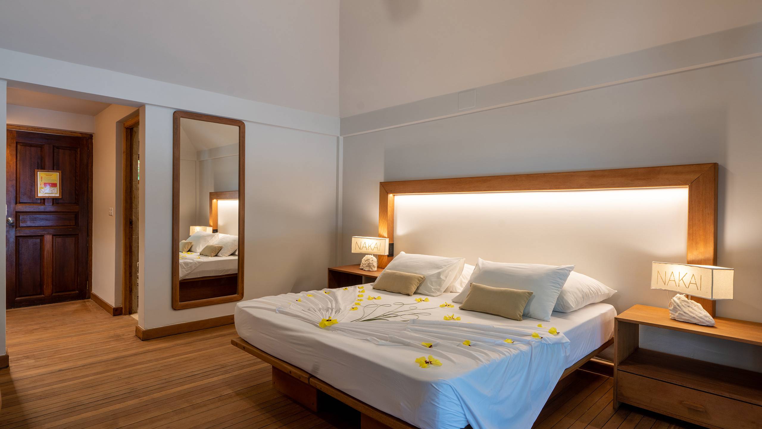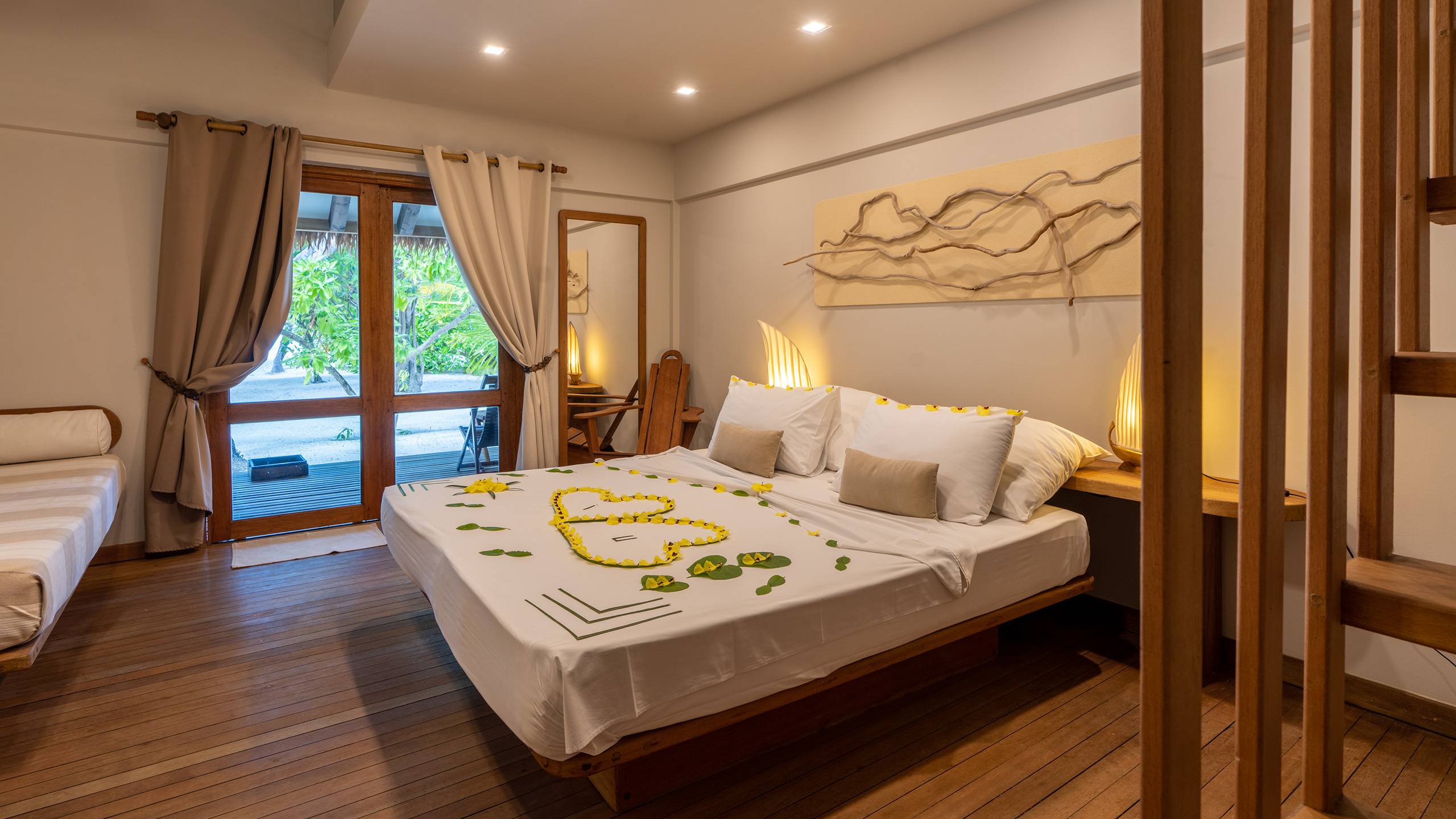 All room categories at Alimatha Nakai Resort include daily housekeeping service. Specific amenities and layouts vary by accommodation type. Early booking recommended for overwater villas during peak season.