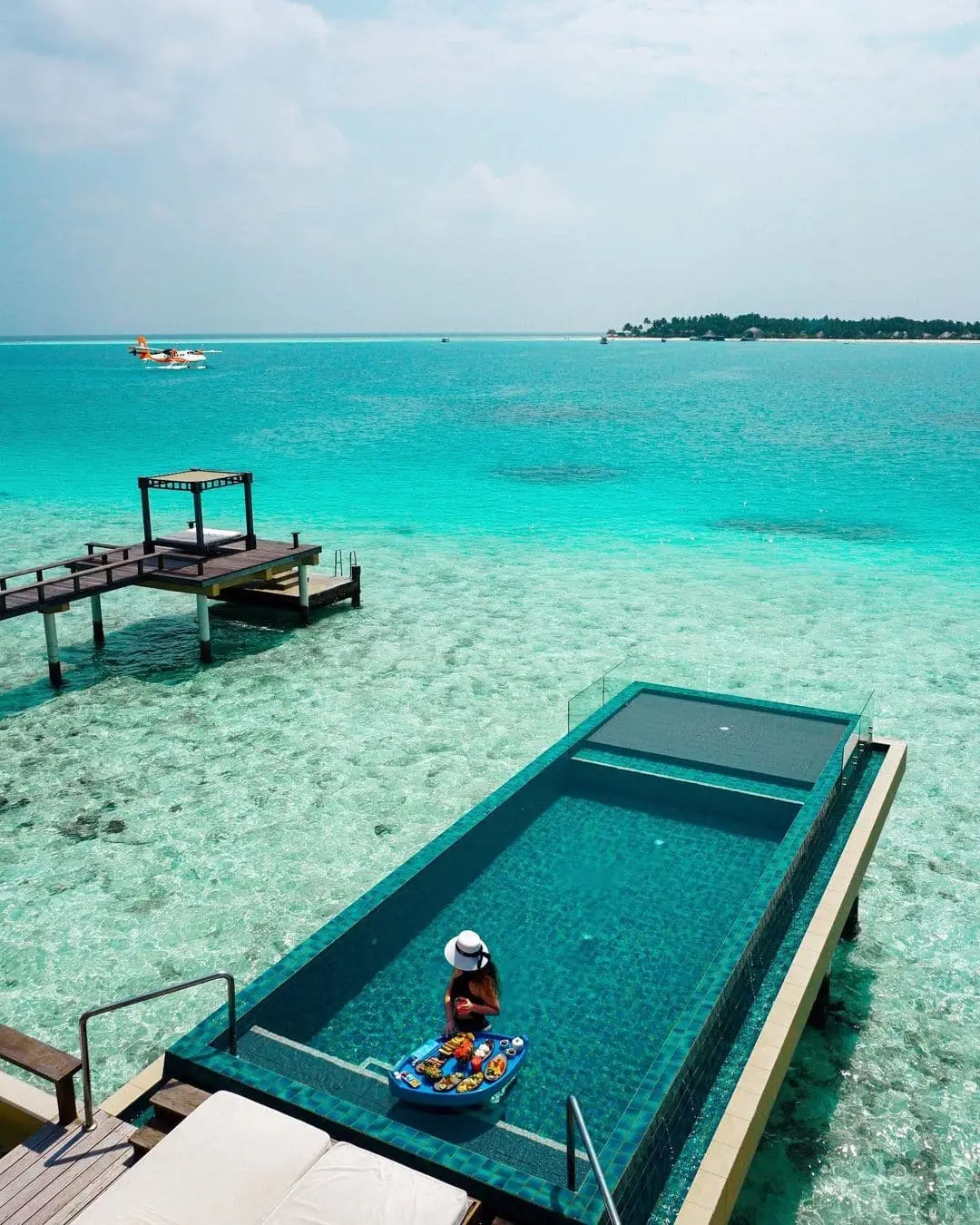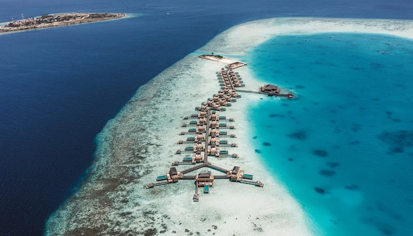 InOcean villas are the first standalone water villa cluster in the Maldives. These two-story villas feature private infinity pools, direct ocean access via trampoline nets, and exceptional house reef snorkeling. They're connected to the main island by hourly ferry service.