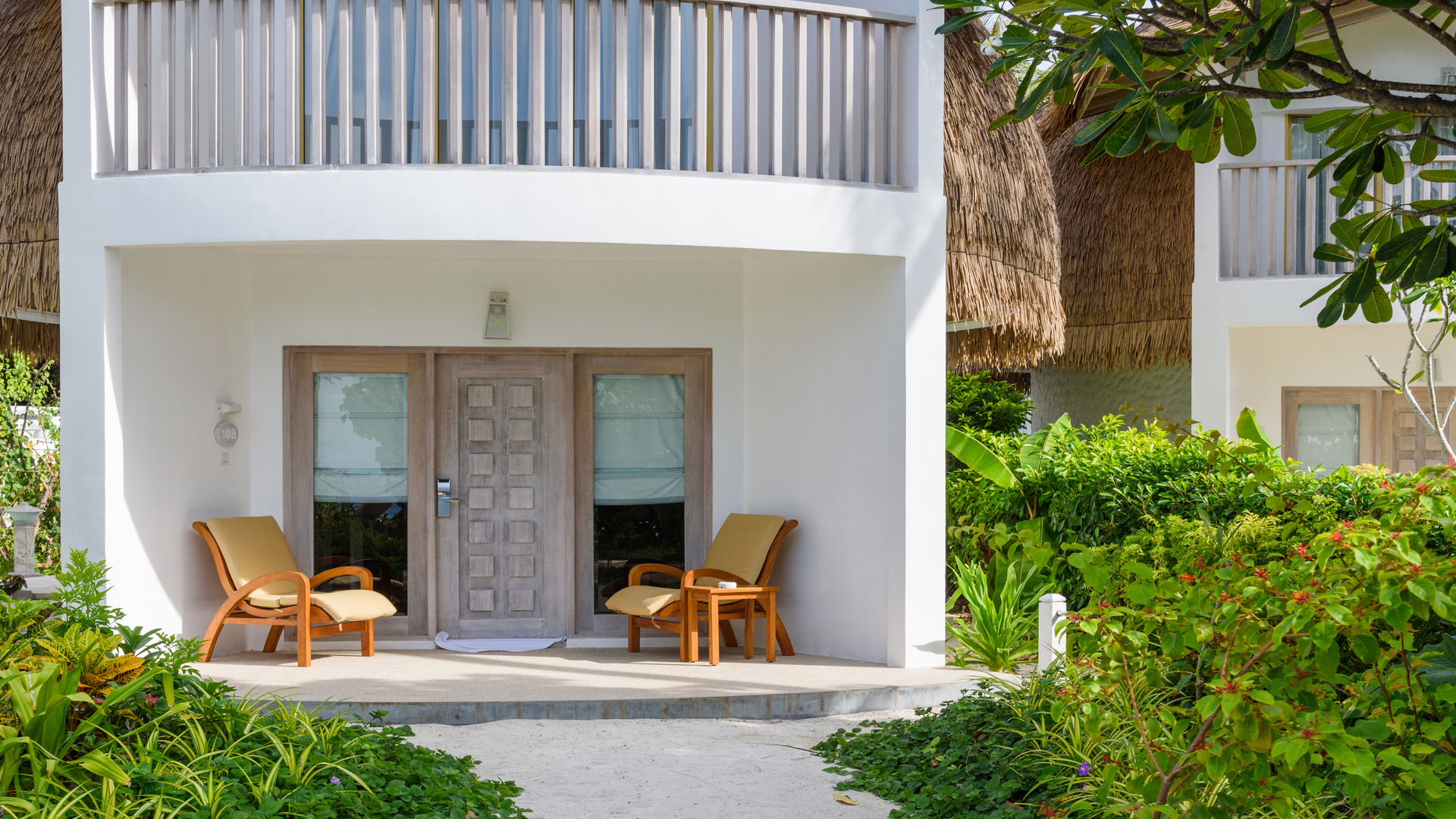 Traditional Maldivian-style wooden chalets at Bandos Maldives with extensive secluded outdoor decking within beautifully manicured tropical gardens.