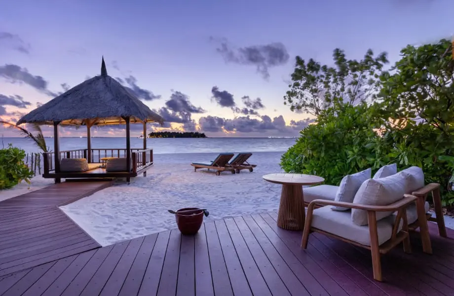 Romantic one-bedroom villa extending over white sand with shaded patio and outdoor shower bringing guests closer to nature at Banyan Tree Maldives Vabbinfaru.
