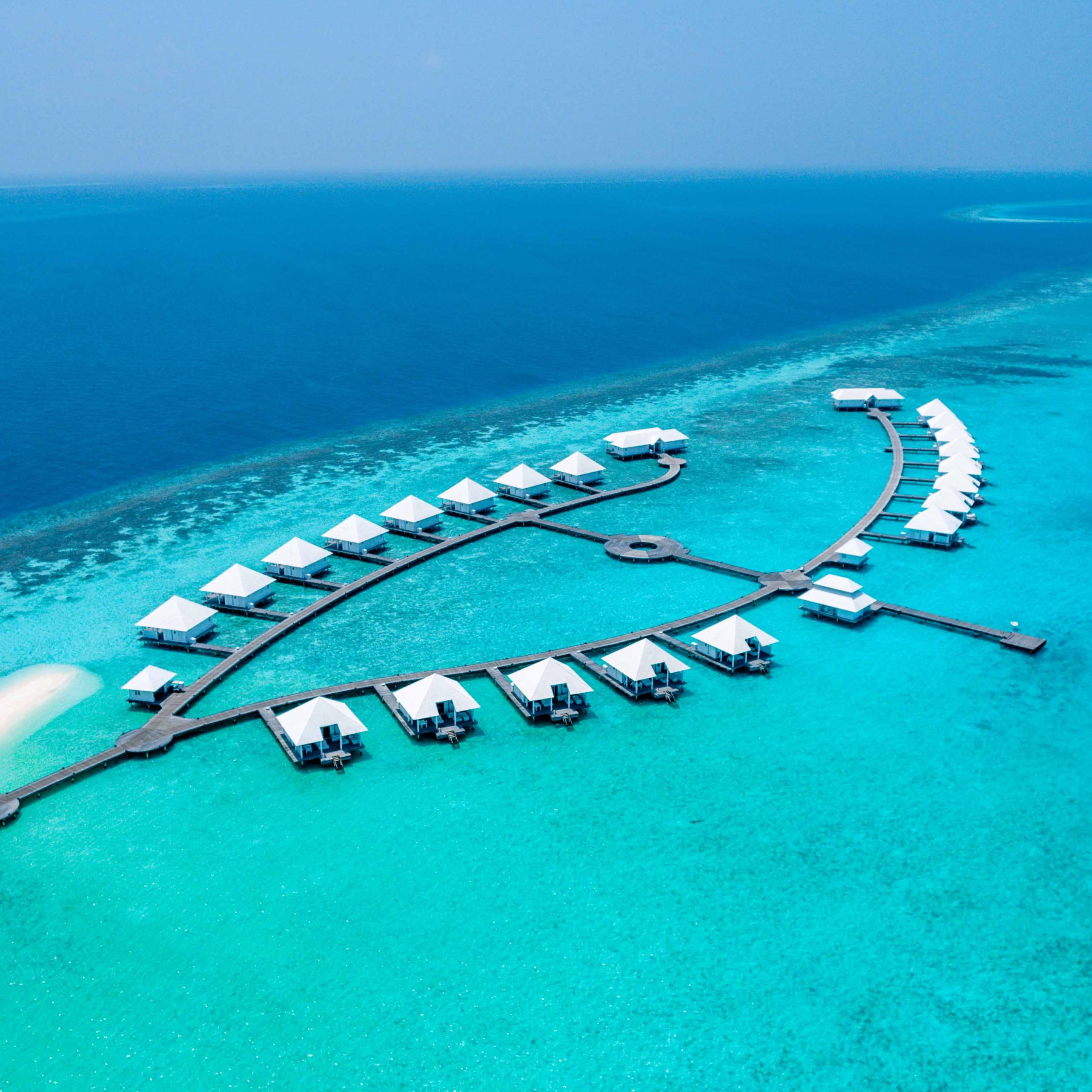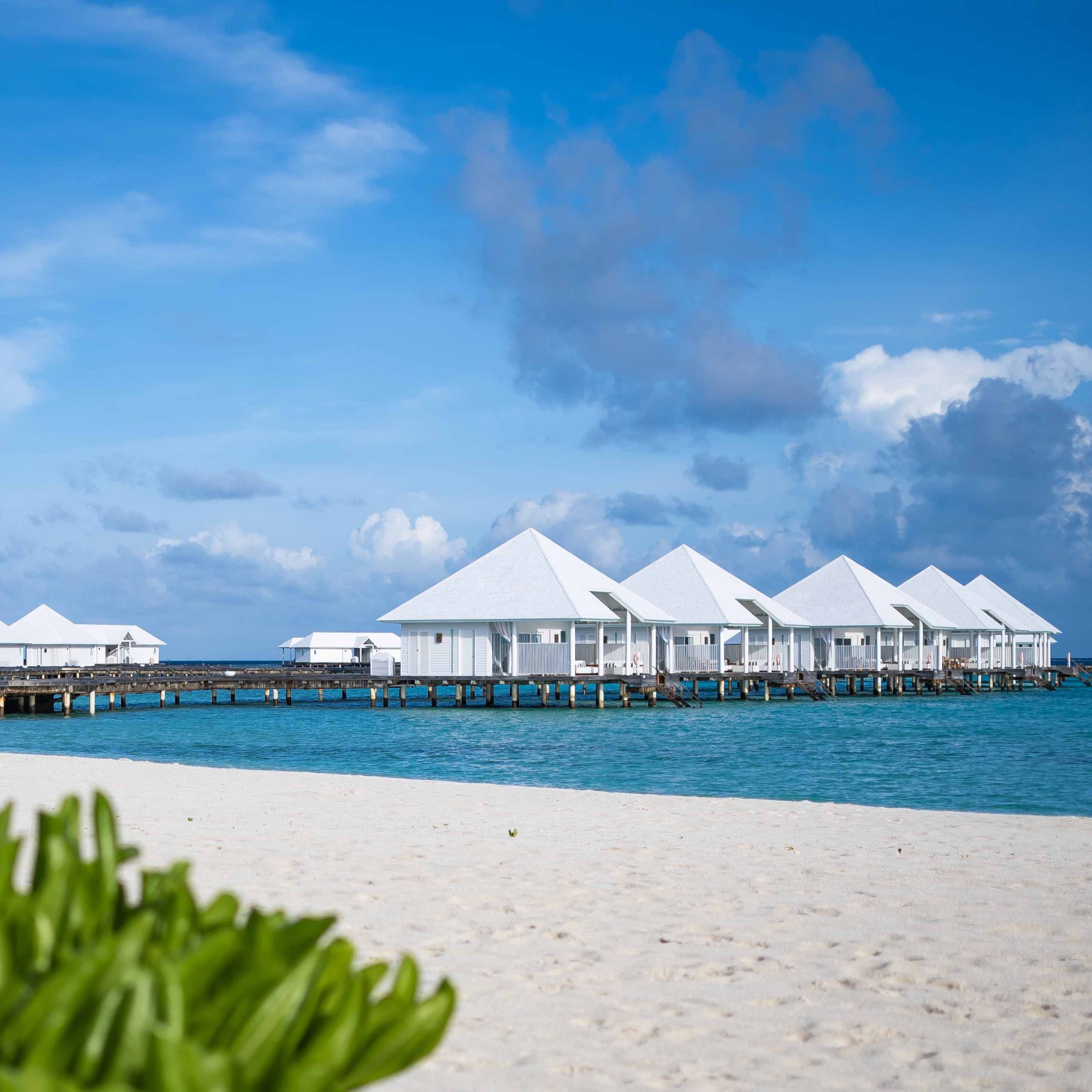 Beach and overwater accommodation; selected categories with private outdoor tubs or small pools.